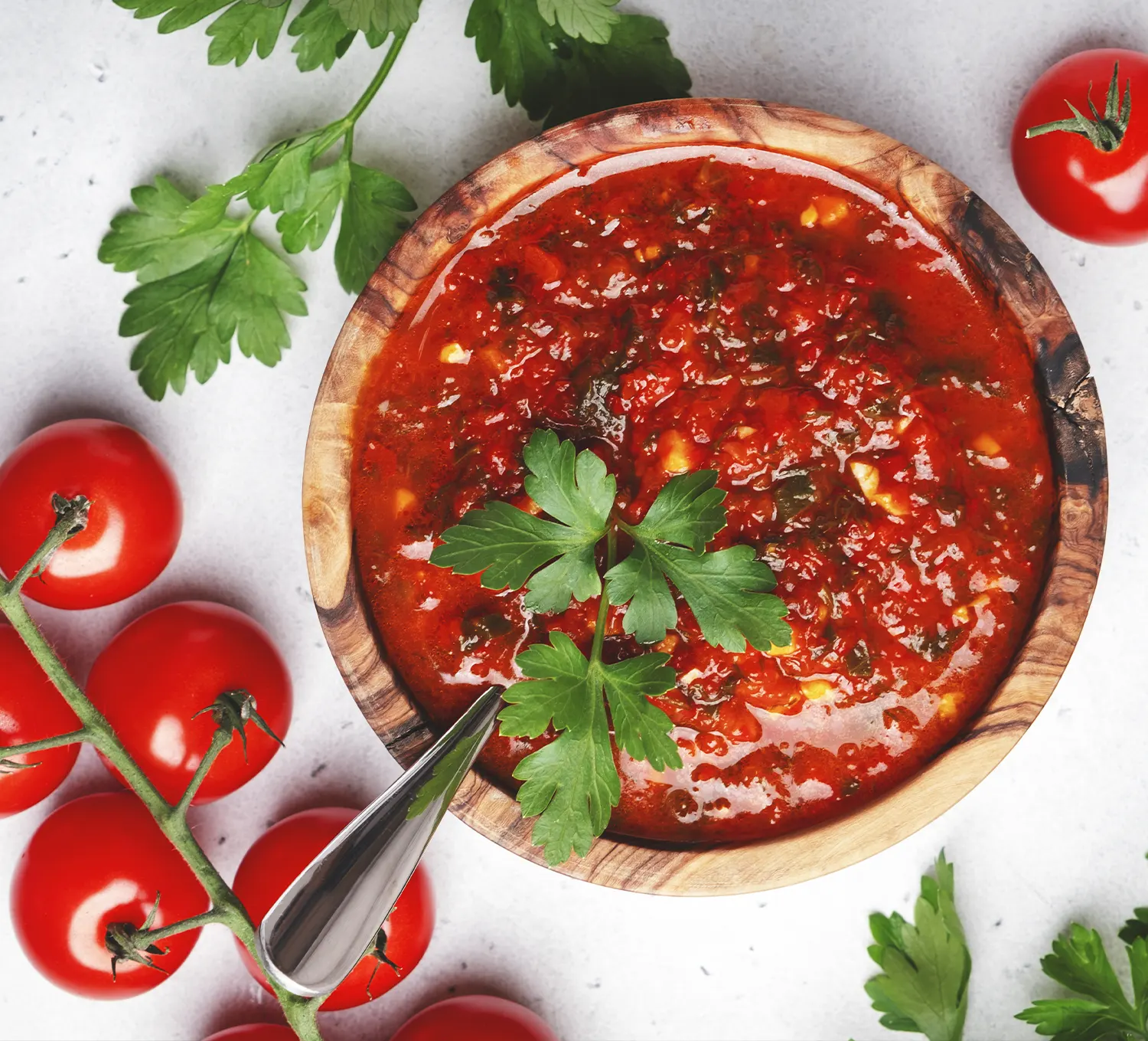 Tomatenpulp (tomatenpulp, zuurteregelaar: citroenzuur), extra vergine olijfolie, boter (MELK), suiker, zout, chilipeper 0.3 %, groentebouillon (SELDERIJ), aroma’s, aromatische kruiden, specerijen. Bevat Gluten. Kan sporen bevatten van: vis, soja, gluten, melk, sulfieten, eieren, selderij en noten.