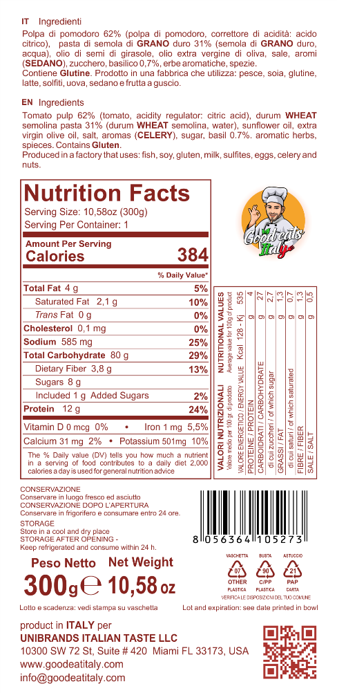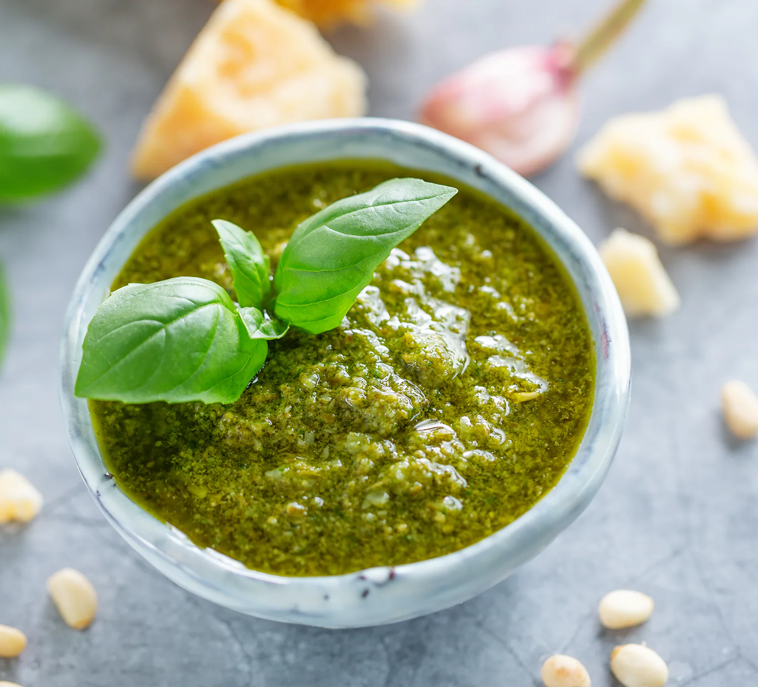 Half afgewerkte basilicum 38 % (basilicum 65 %, zonnebloemolie, zout), zonnebloemolie, aardappel, Grana Padano kaas 2 % (MELK, zout, stremsel, lysozym: eiwit van EI), natuurlijke aroma’s, PIJNBOOMPITTEN 0.7 %, aromatische kruiden. Bevat Gluten. Kan sporen bevatten van: vis, soja, gluten, melk, sulfieten, eieren, selderij en noten.