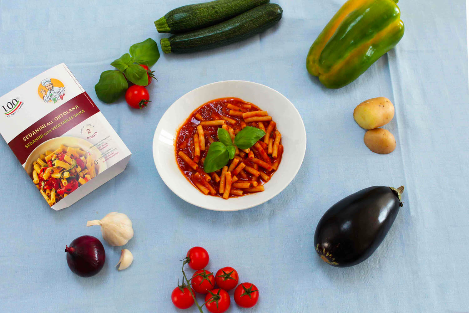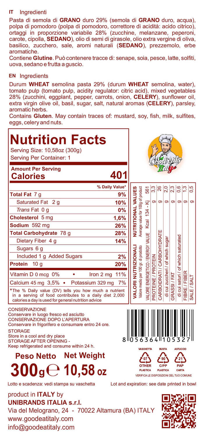 Durum TARWEGRIESMEEL pasta 29 % (durum TARWEGRIESMEEL, water) tomatenpulp (tomatenpulp, zuurteregelaar: citroenzuur), groentemix 28 % (courgette, aubergine, paprika, wortel, ui, SELDERIJ), zonnebloemolie, extra vergine olijfolie, boter (MELK), basilicum, suiker, zout, natuurlijke aroma’s (SELDERIJ), peterselie, aromatische kruiden. Bevat Gluten. Kan sporen bevatten van: vis, soja, gluten, melk, sulfieten, eieren, selderij en noten.