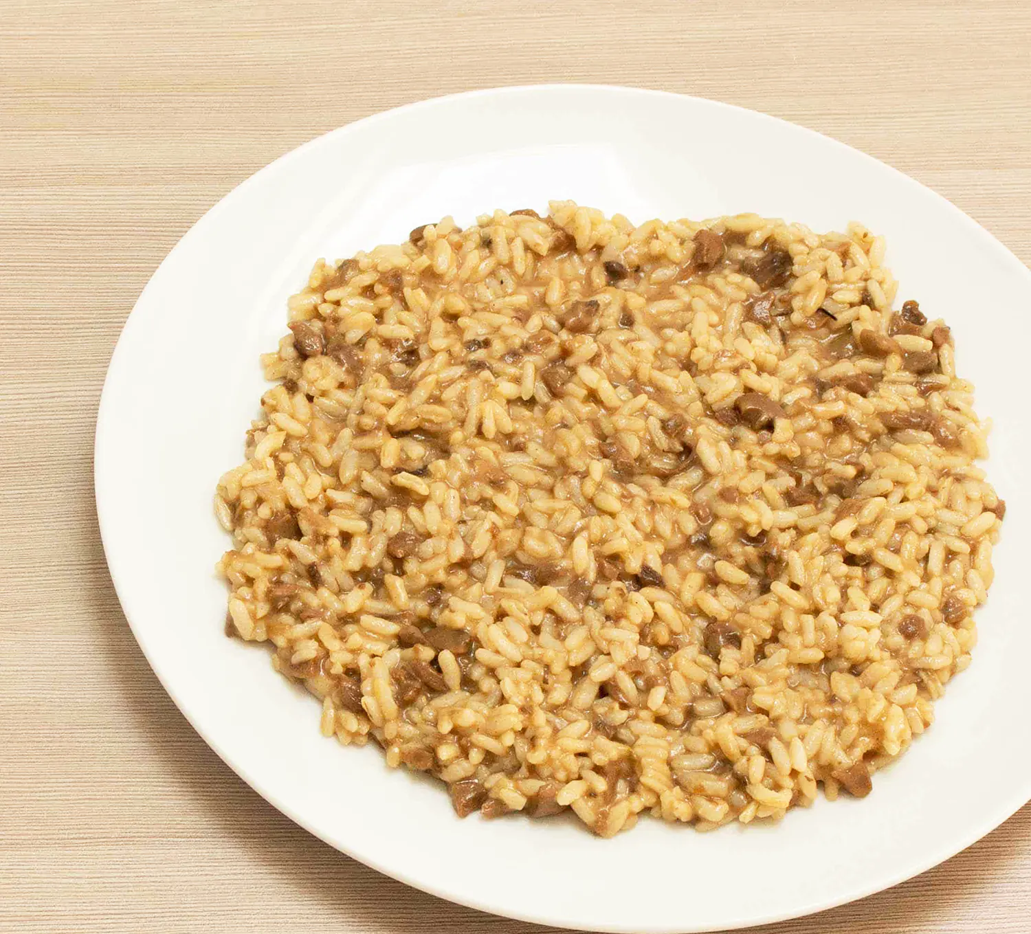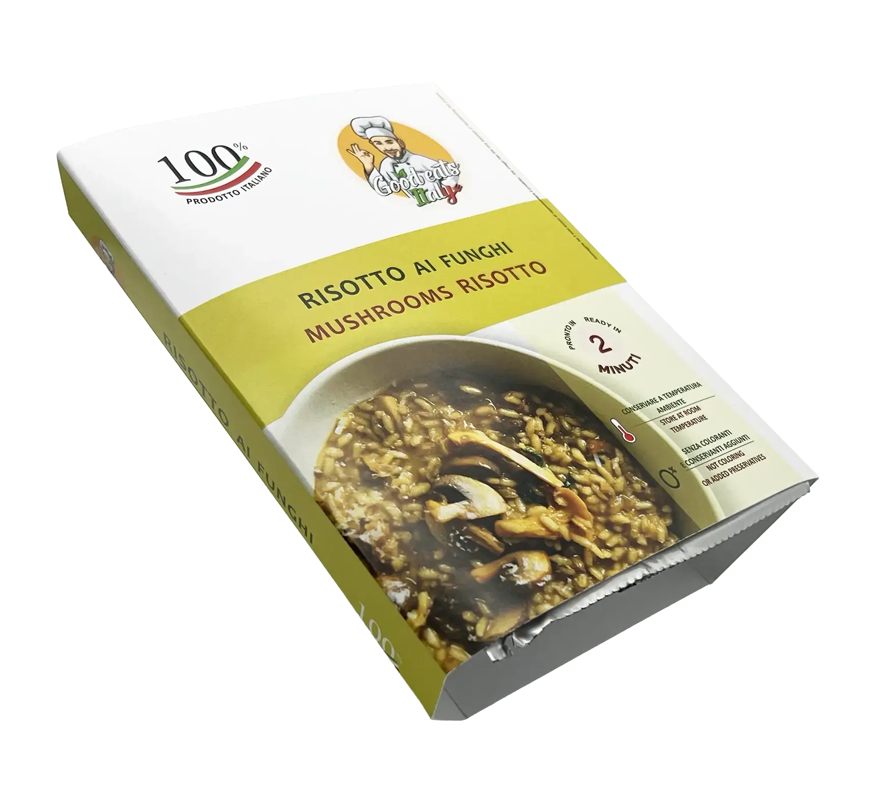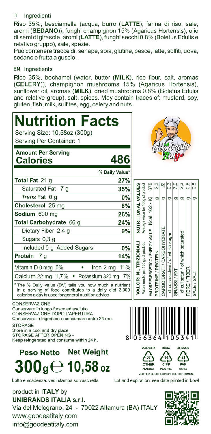Rijst 35 %, bechamelsaus (water, boter (MELK), rijstmeel, zout, aroma’s (SELDERIJ)), champignons 15 % (Agaricus Hortensis), zonnebloemolie, aroma’s (MELK), gedroogde paddenstoelen 0.8 % (Boletus Edulis en afstammelingen), zout, specerijen. Kan sporen bevatten van vis, soja, gluten, melk, sulfieten, eieren, selderij en noten.