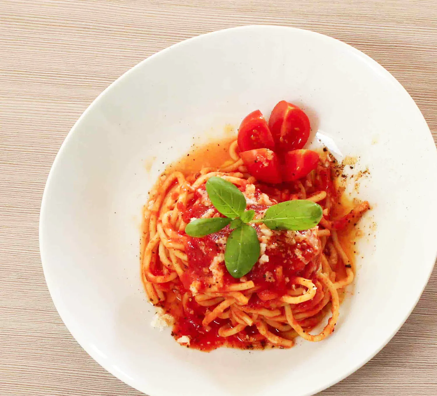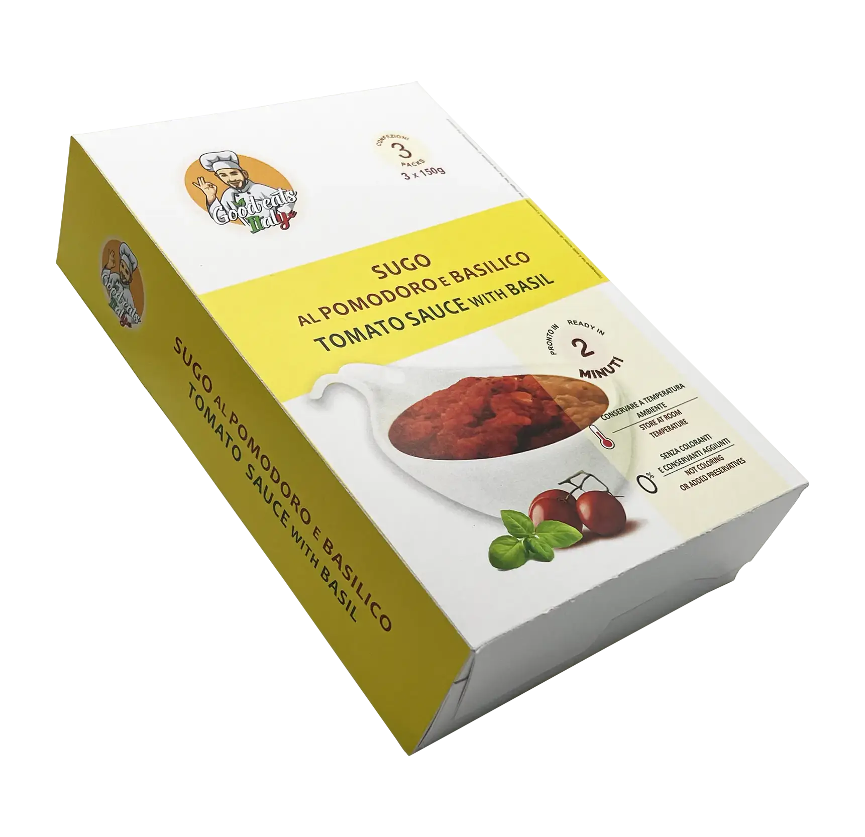 Tomatenpulp (tomaat, zuurteregelaar: citroenzuur E330), extra vergine olijfolie, zout, aroma’s (SELDERIJ), suiker, basilicum 0.9 %, aromatische kruiden, specerijen. Bevat Gluten. Kan sporen bevatten van: vis, soja, gluten, melk, sulfieten, eieren, selderij en noten.